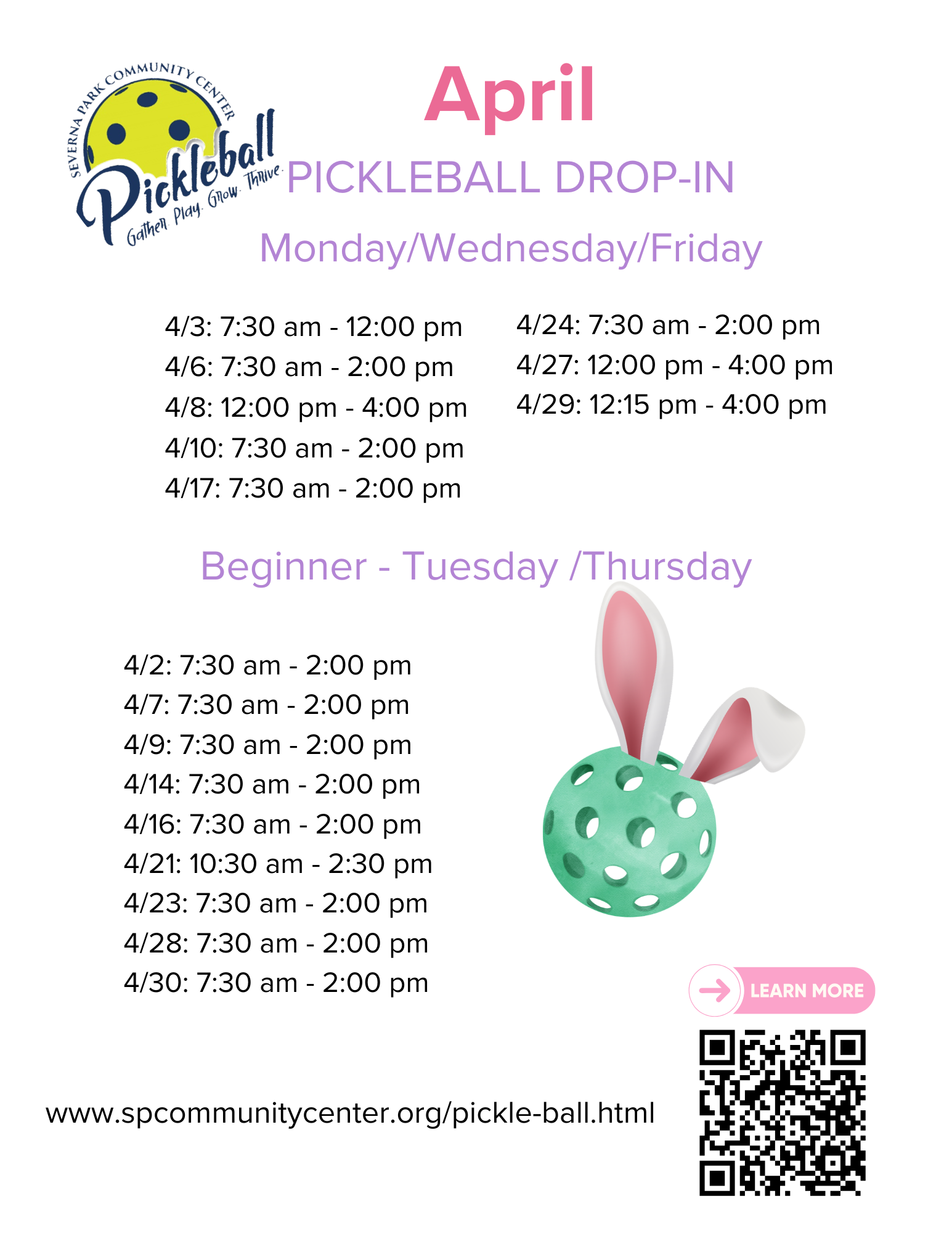 Open to athletes of all ages and abilities, pickleball is an active game played with a paddle and a whiffle ball on a court that has a net. A fast-growing sport throughout the U.S. with a governing body (USA Pickleball Association), regulations and tournaments, pickleball volleys like tennis and scores like badminton. At the Severna Park Community Center, we play for fun, fitness, and friendships.