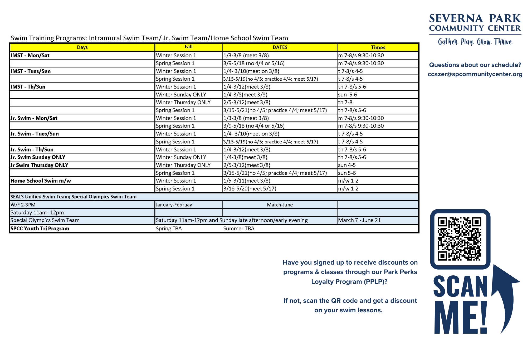The Severna Park Community Center provides opportunities for all youth and adults who wish to be part of a swim training program. Talented, caring coaches and a supportive community provide a platform for lifelong skills and friendships.